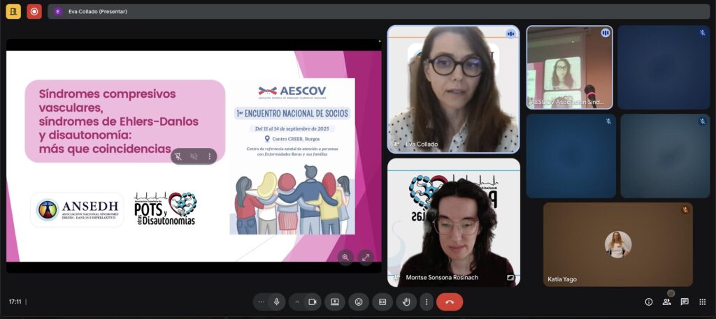 El pasado 11 de septiembre, Eva Collado, vicepresidenta de ANSEDH (Asociación Nacional de Síndrome de Ehlers-Danlos e Hiperlaxitud) y Montse Sonsona, vicepresidenta de AEPOD (Asociación Española de PoTS y otras Disautonomías) y delegada de ANSEDH en Aragón, participaron de forma online en el I Encuentro de la Asociación Española de Síndromes Compresivos Vasculares (AESCOV), celebrado en el CREER de Burgos. Presentaron la charla conjunta “Síndromes compresivos vasculares , Síndrome de Ehlers-Danlos y disautonomía, más que coincidencias”, donde abordaron la interrelación entre los síndromes compresivos vasculares (SCV), el síndrome de Ehlers-Danlos (SED) y las disautonomías, especialmente el PoTS (síndrome de taquicardia postural).