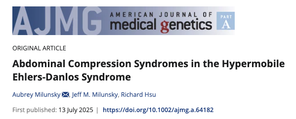 Milunsky A, Milunsky JM, Hsu R. Abdominal Compression Syndromes in the Hypermobile Ehlers-Danlos Syndrome. Am J Med Genet A. 2025 Jul 13:e64182. doi: 10.1002/ajmg.a.64182 Epub ahead of print. PMID: 40653826.
