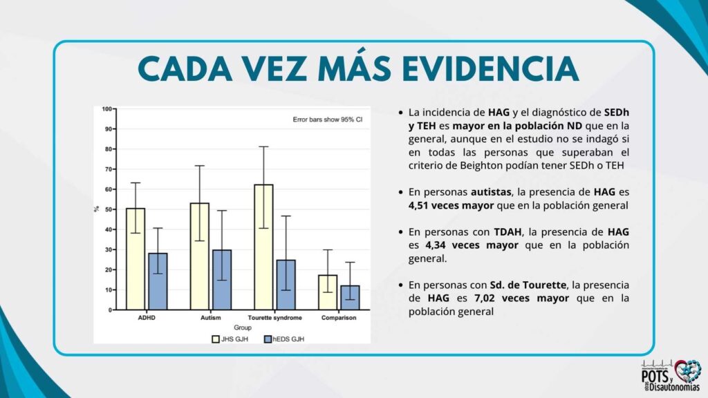 Durante la charla se explicó cómo el criterio de Beighton, que evalúa nueve articulaciones mediante cinco maniobras, permite identificar la hipermovilidad articular generalizada (HAG). Los ponentes compartieron datos relevantes que muestran una incidencia significativamente mayor de HAG en población neurodivergente: