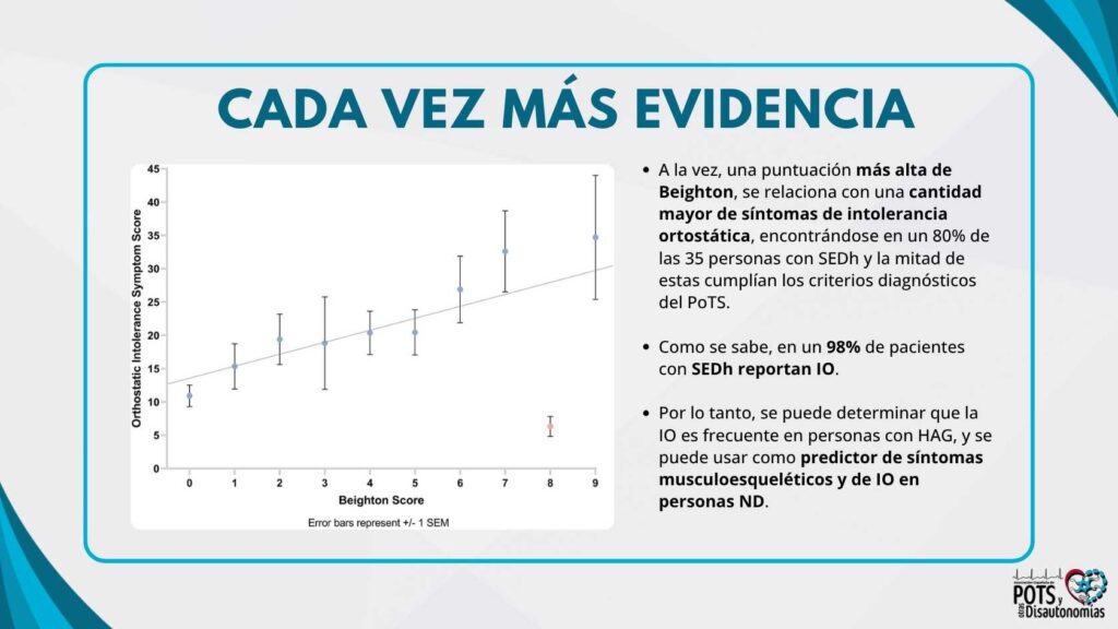 Asimismo, se destacó que las personas con puntuaciones más altas en la escala de Beighton suelen presentar mayor dolor musculoesquelético y síntomas de intolerancia ortostática, un marcador habitual en quienes padecen síndromes de Ehlers-Danlos hipermóvile (SEDh) y disautonomía.