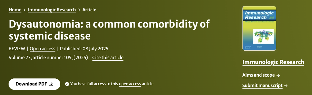 Blitshteyn S. Dysautonomia: a common comorbidity of systemic disease. Immunol Res. 2025 Jul 8;73(1):105. doi: 10.1007/s12026-025-09661-2. PMID: 40624434; PMCID: PMC12234583.