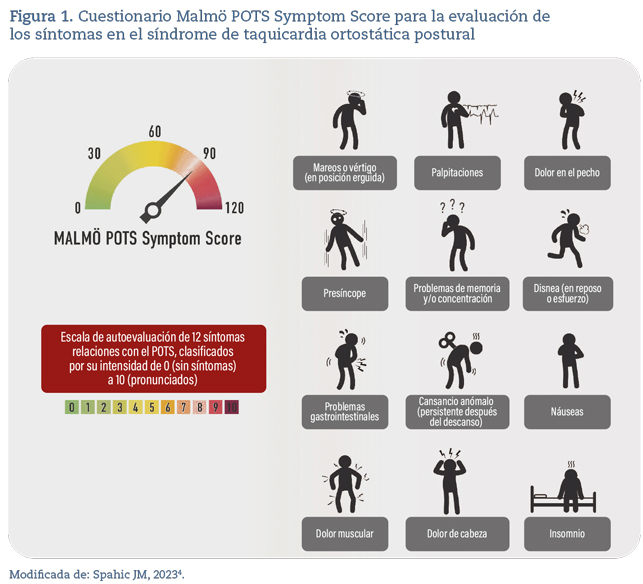 Herramienta de evaluación diseñada para medir la carga sintomática en personas con síndrome de taquicardia postural (PoTS). Es un cuestionario subjetivo que consta de 12 ítems que abarcan diversos síntomas comunes en PoTS, como mareos, palpitaciones, fatiga, problemas de concentración y trastornos gastrointestinales. Ayuda a detectar y hacer seguimiento del PoTS.