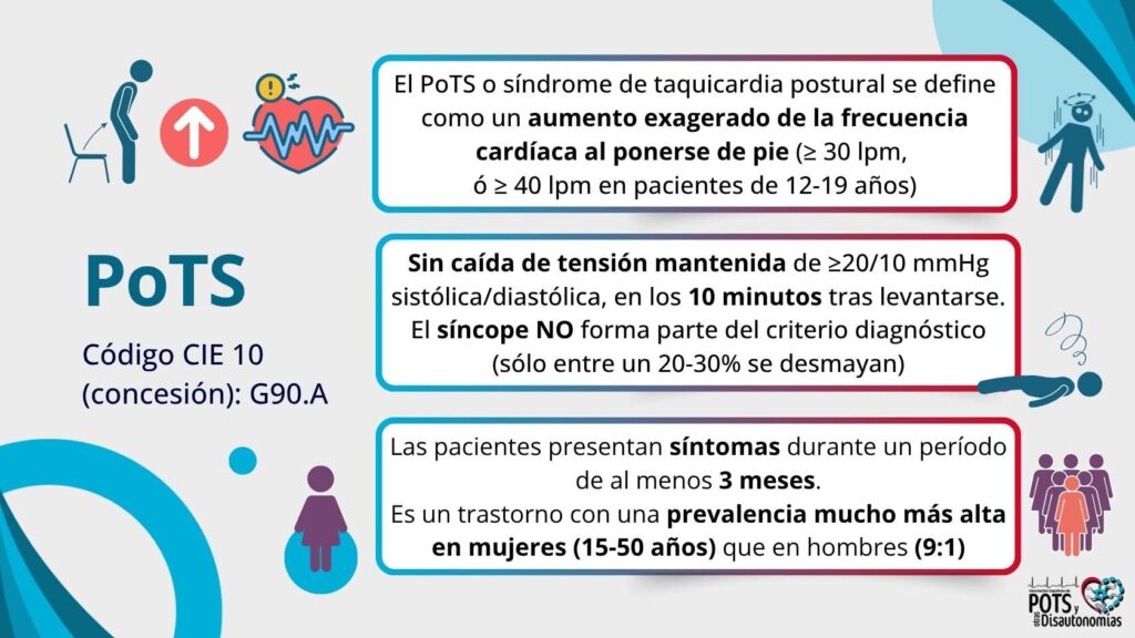 Ahora (PoTS): se enfatiza la parte del cambio postural, reconociendo que los síntomas pueden aparecer o empeorar con cualquier cambio de postura (sentarse, agacharse, levantar los brazos, incluso estando tumbada, como por ej, al girarse).