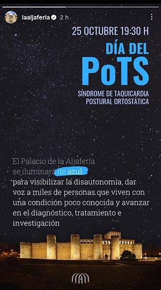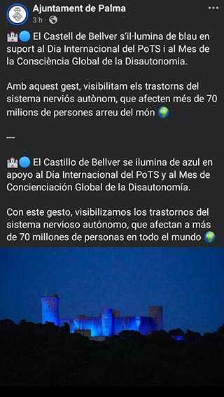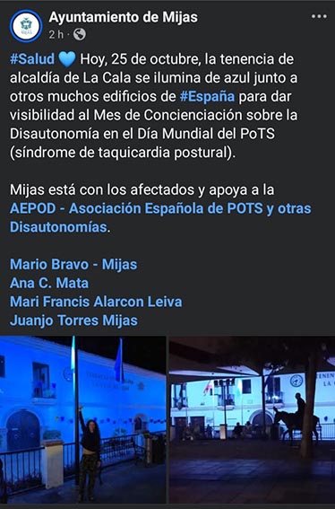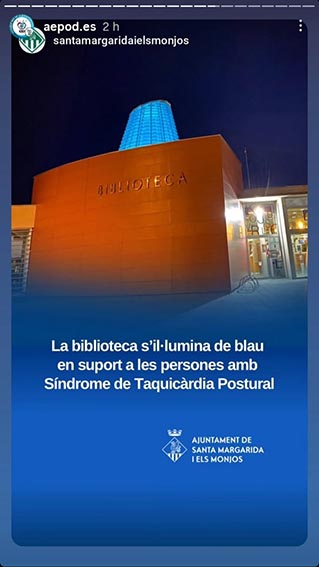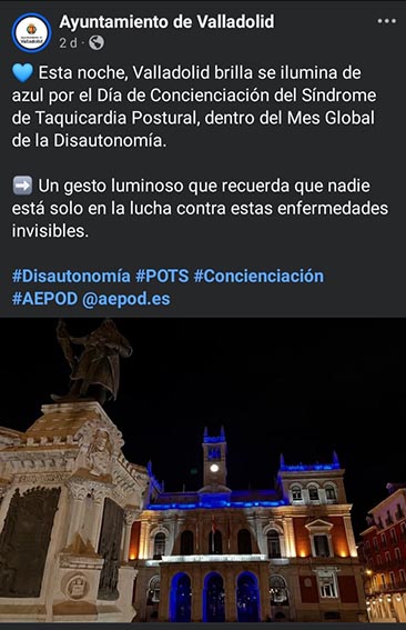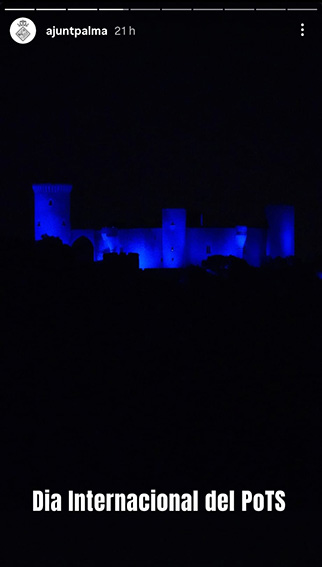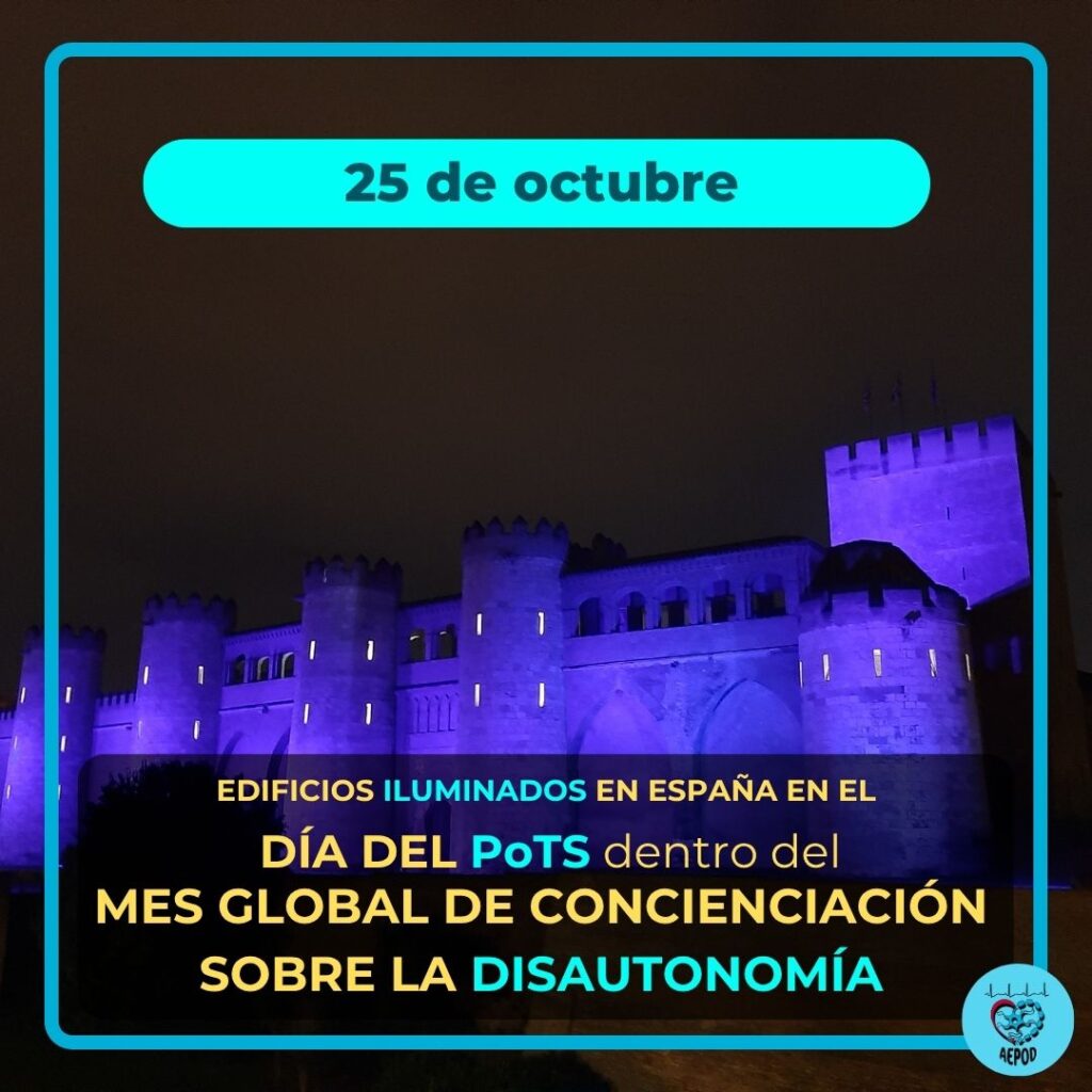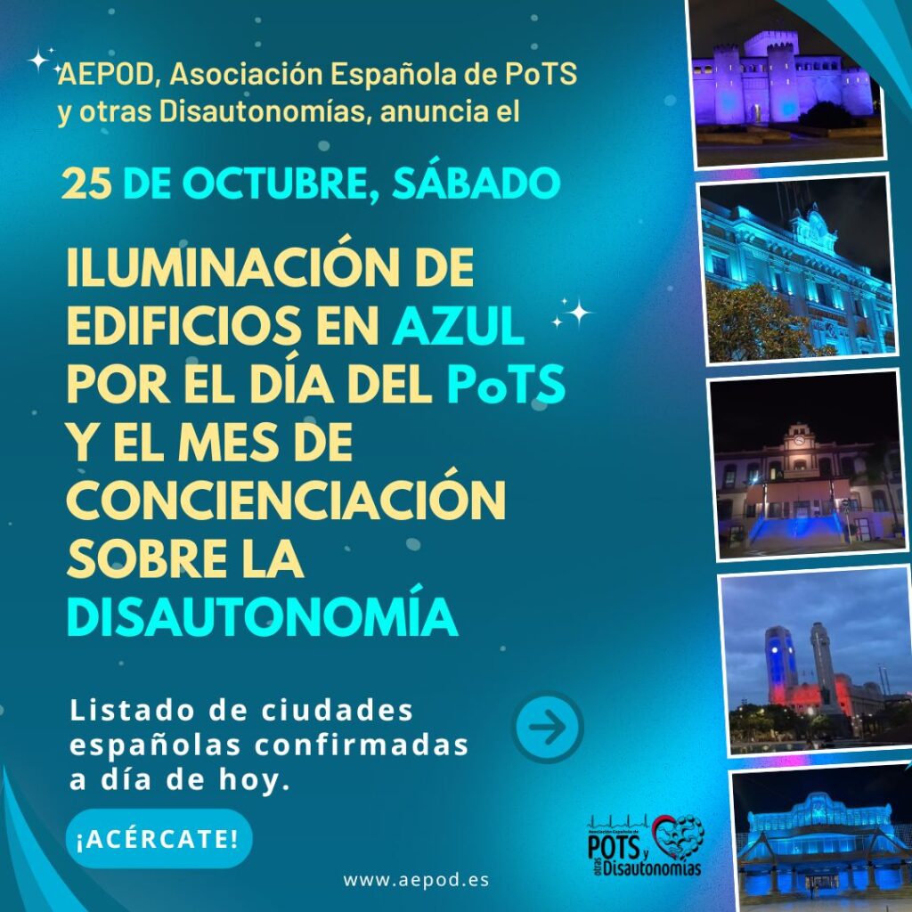 Por segundo año e impulsado por AEPOD (Asociación Española de PoTS y otras Disautonomías), varios edificios, fuentes, monumentos y hospitales de nuestro país se tiñeron de azul a partir de las 20:00 h para dar visibilidad al Mes de Concienciación Global sobre la Disautonomía.